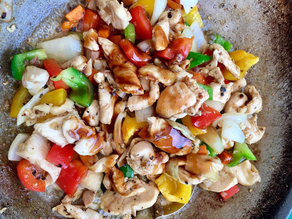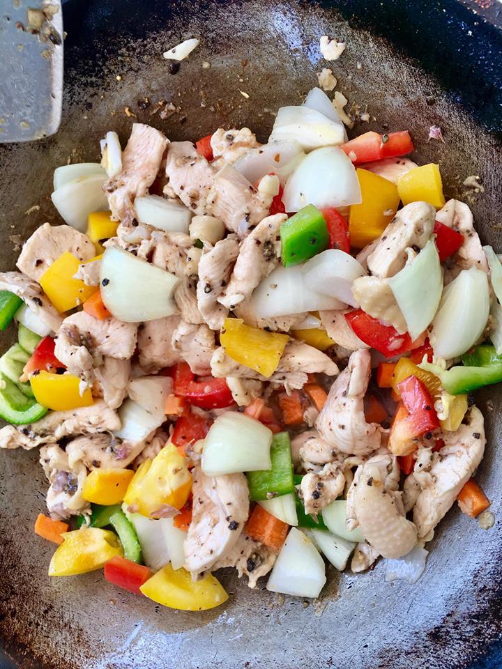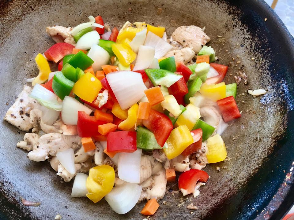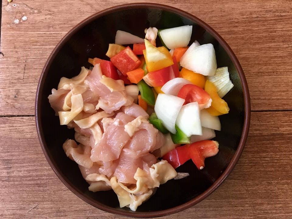 - พอเนื้อไก่สุก ใส่ พริกสามสี และ หอมหัวใหญ่ลงไป จ้าาา