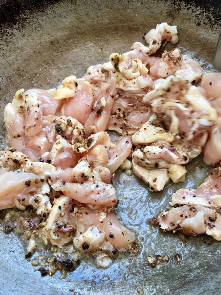 - จากนั้นนำเนื้อไก่หั่นชิ้นลงไปผัด