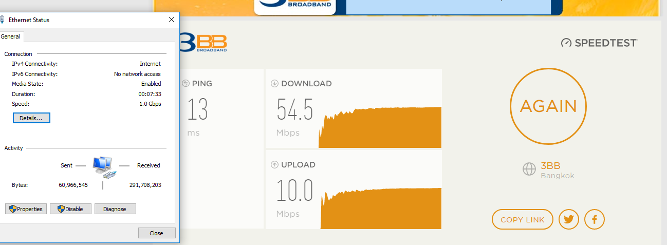 - เสียบรู2 เทสสปีดได้ประมาณ10Mb อัพโหลด10Mb ดูค่าEthenet Statusมันสปีดได้100Mb เอ๊ะไงงั้นล่ะเมื่อวานยังดีๆอยู่เลย