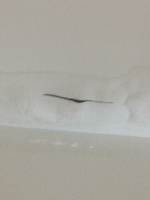 สีผนังที่ติดกับฝ้า มีรอยแตกร้าว เป็นทั้งแนวฝ้าเลยครับ เหมือนจะมีเทปปิดอยู่ด้วยครับ