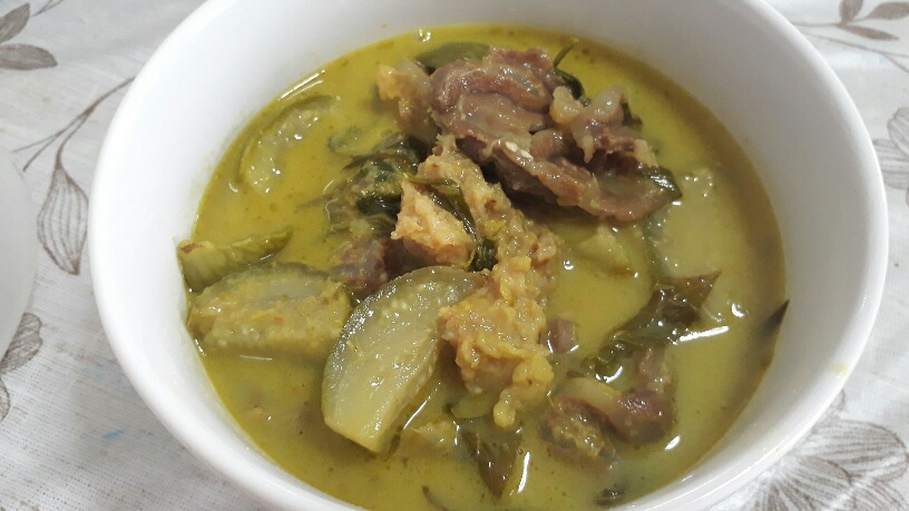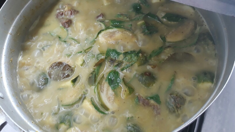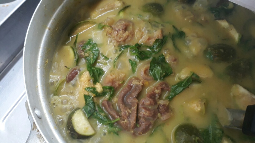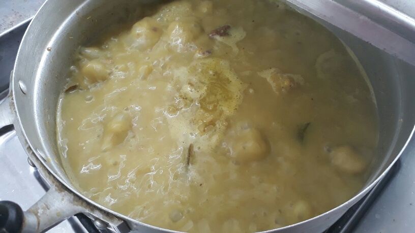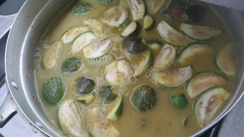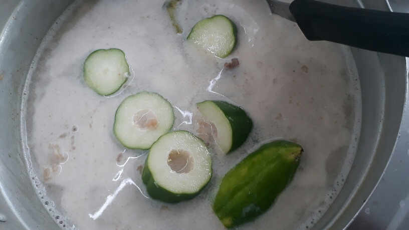 เสร็จแล้วเติมหางกะทิ ใส่มะละกอ(เก็บมะละกอลูกจิ๋วหน้าบ้าน ที่พ่อปลูกไว้) ต้มประมาณครึ่งชั่วโมง