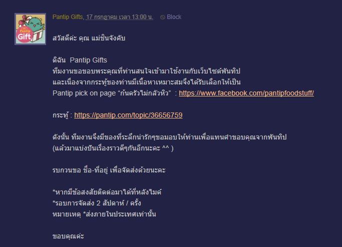 แล้วมะวาน 31/7/2017 มีไปรษณีย์ มาส่ง ขอบคุณของที่ระลึกจาก Pantip และถือเป็นของขวัญวันเกิดด้วยนะค่ะ 01/08 วันเกิดเราพอดี