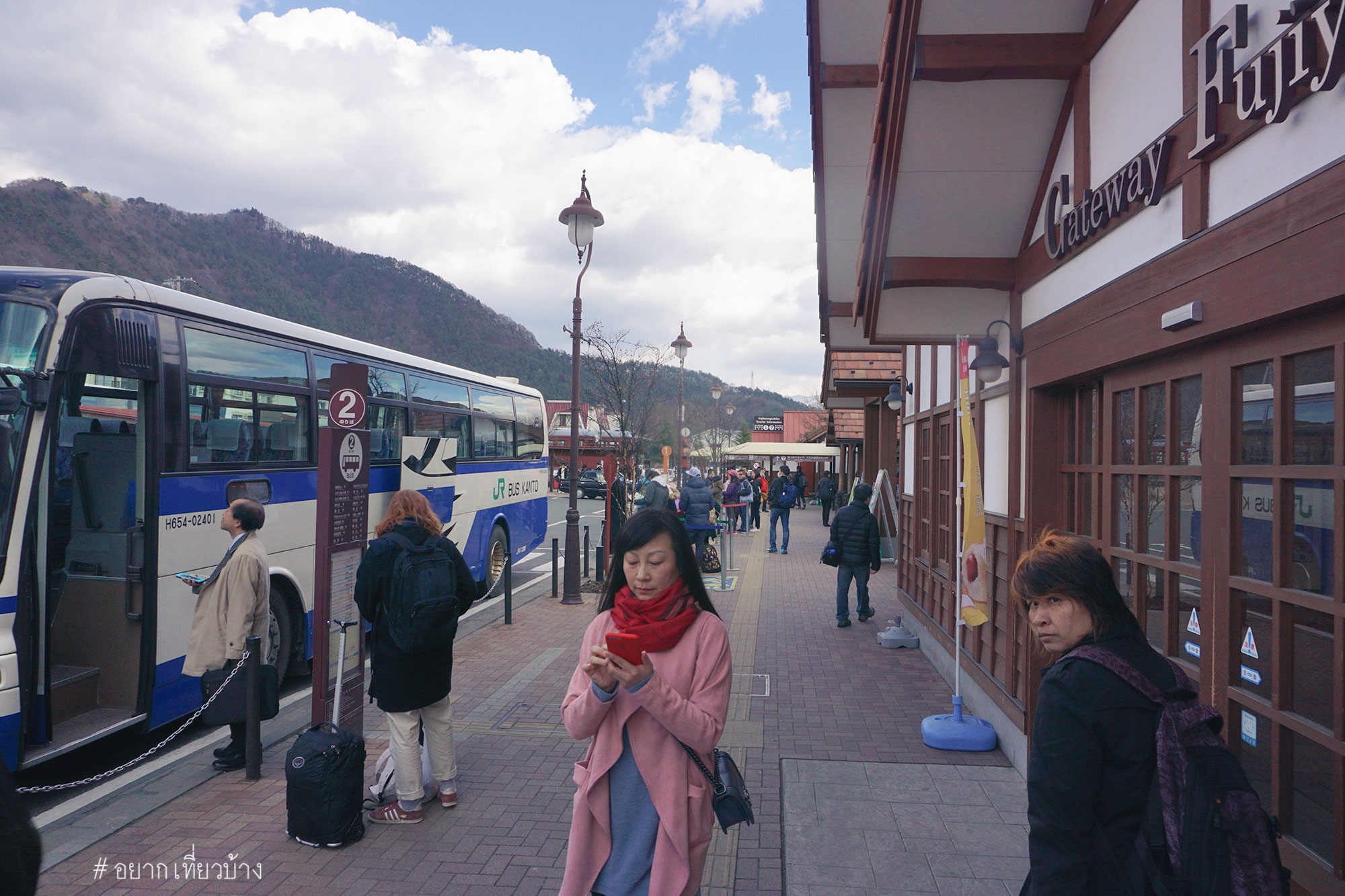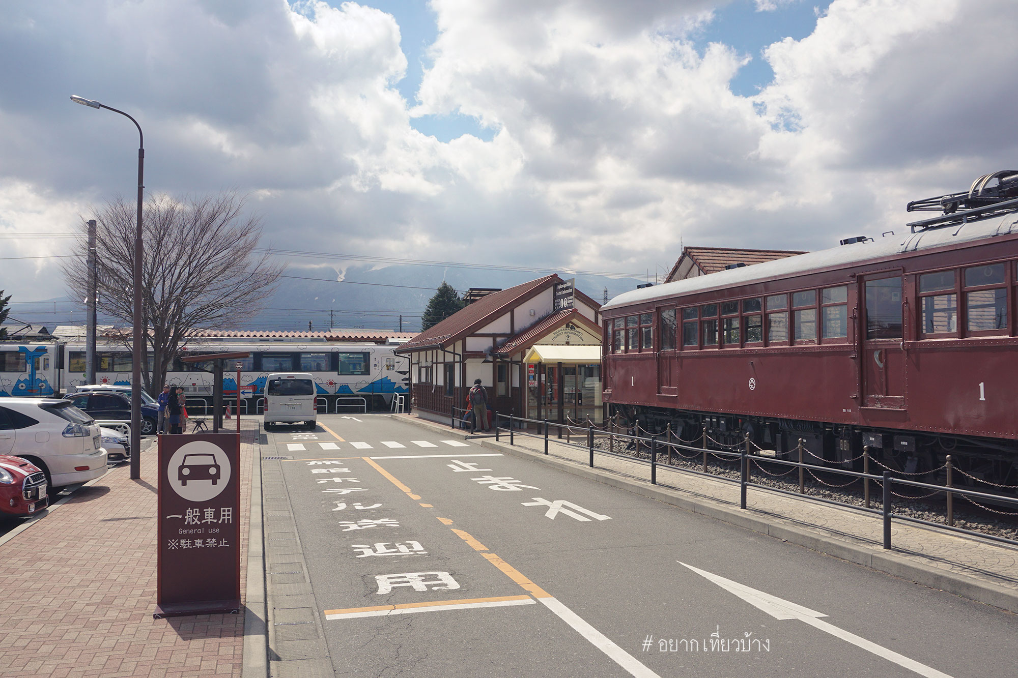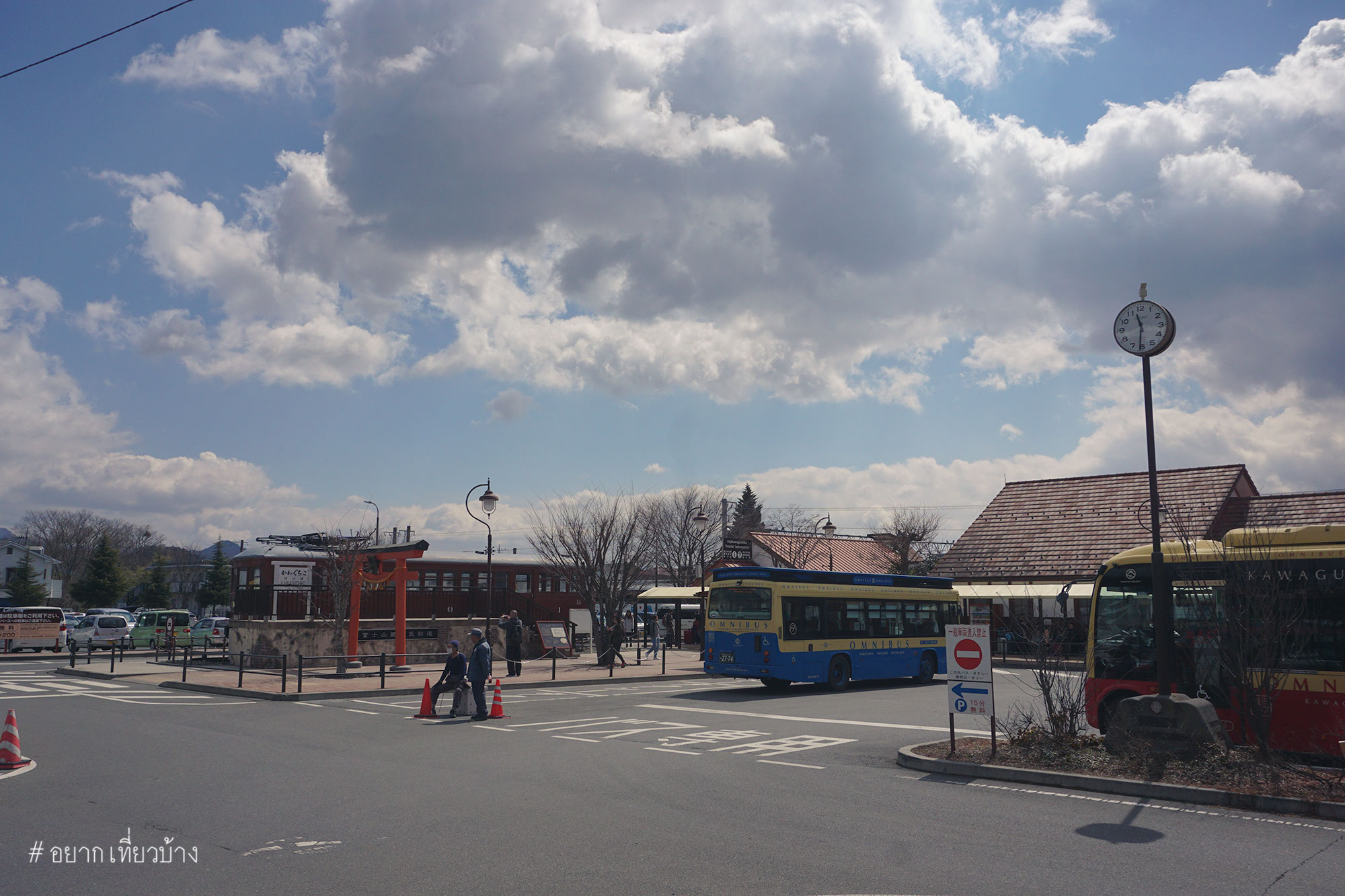 ถึง Kawaguchiko Station รีบเดินไปถ่ายรูปมุมมหาชนหน้าสถานี พอหันหลังกลับมาแค่นั้นแหละ เมฆบังมิด จบข่าว เศร้านิดหน่อยได้แต่หวังว่าสักพักเมฆน่าจะหายไป ช่วงรอรถไฟที่เราจะไป เจดีย์แดง(Chureito Pagoda) ก็หามุมเดินเล่นรอบๆสถานี Kawaguchiko ครับ