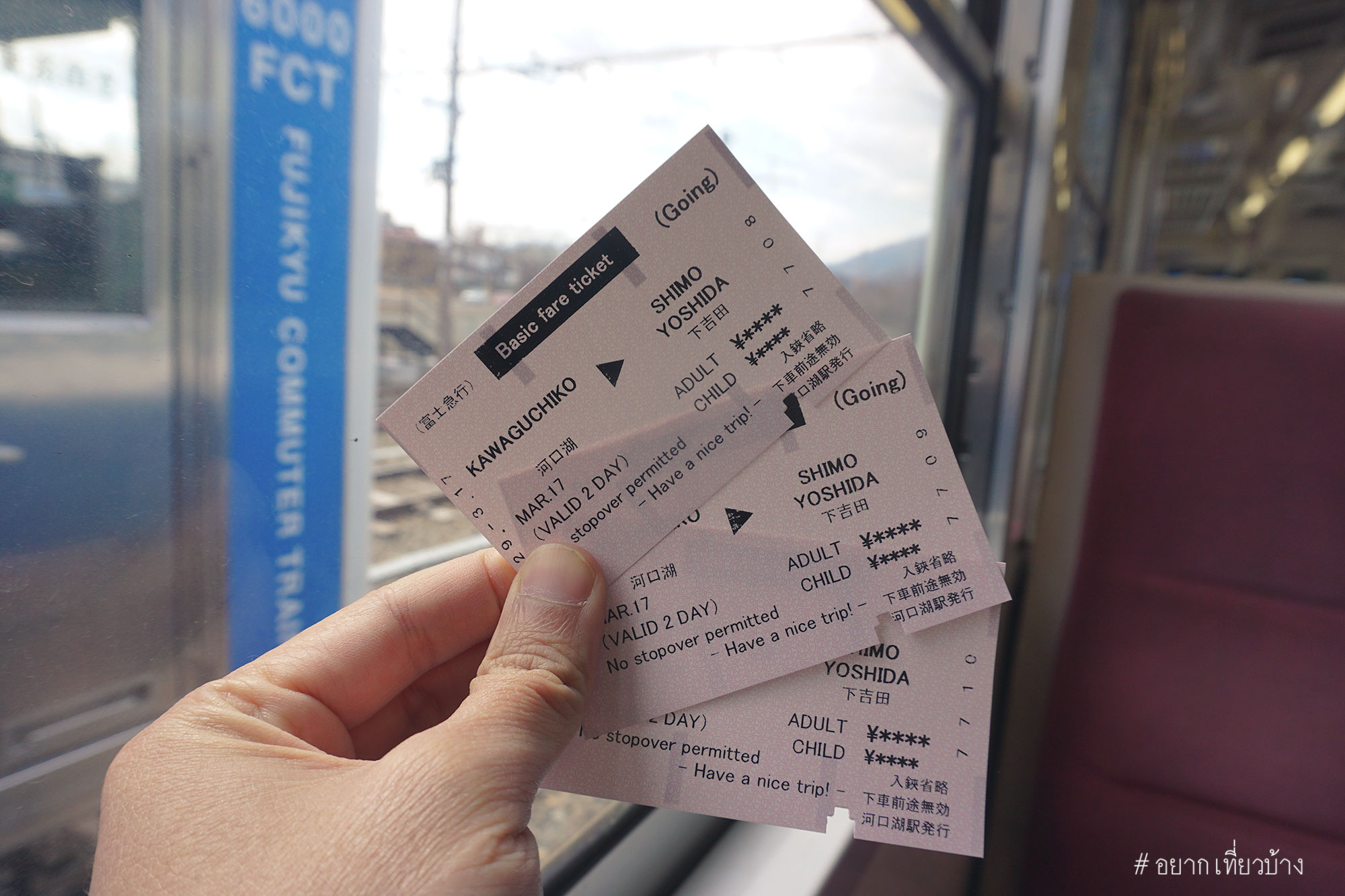 เริ่มออกจาก สถานี JR Akihabara ไปลงที่ สถานี Otsuki เรานั่งหน้าขบวน Fujikyu Railway มุ่งไป Kawaguchiko Station เคยเห็นในกระทู้พันทิพย์บอกว่าเพิ่มอีกคนละ 200 เยน ได้นั่งโบกี้หน้า จะรออะไรครับซื้อเลย ได้ดูวิวรอบด้านชัดๆ เลยครับ จำได้ว่าตอนกลับเจ้าหน้าที่ขอดูตั๋วกับพาสปอร์ต แล้วให้ตังค์คืนด้วย เราก็รับมาแบบงงงง คือดีอะ
