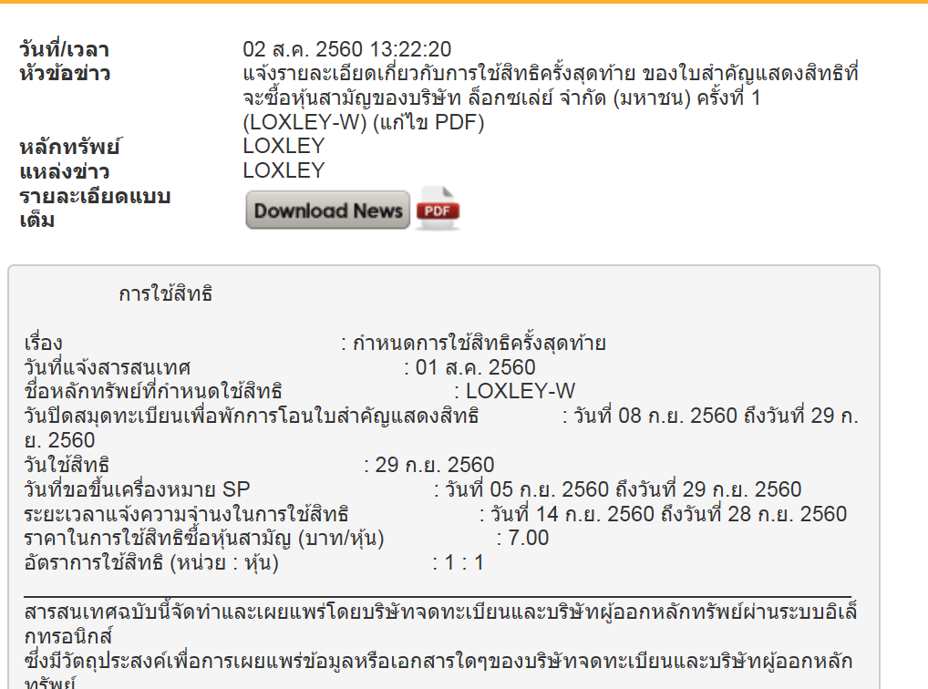 เนื่องจาก 14 สิงหาคม 2560 เป็นวันหยุดทำการ ซื้อขายวันสุดท้ายได้เลื่อนขึ้นมาเป็น 11 สิงหาคม 2560 เหลือเวลา 9 (ไม่รวมวันนี้ 31/7/2560) ทำการซื้อขาย ระหว่างนี้ไม่ว