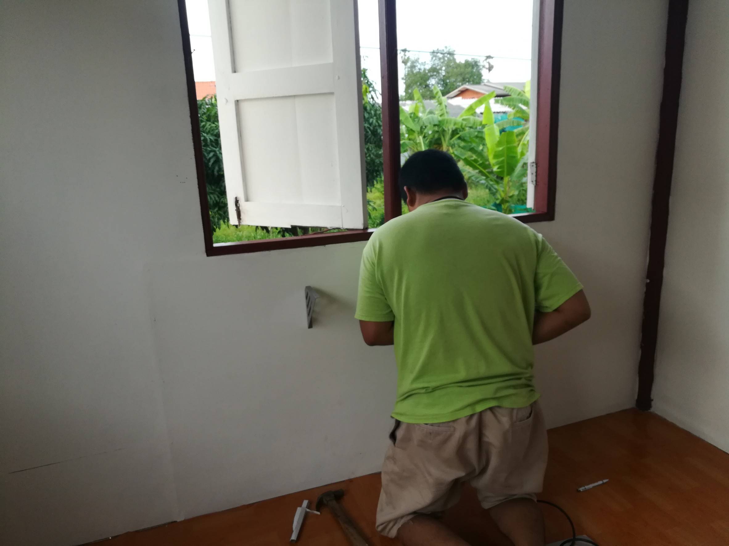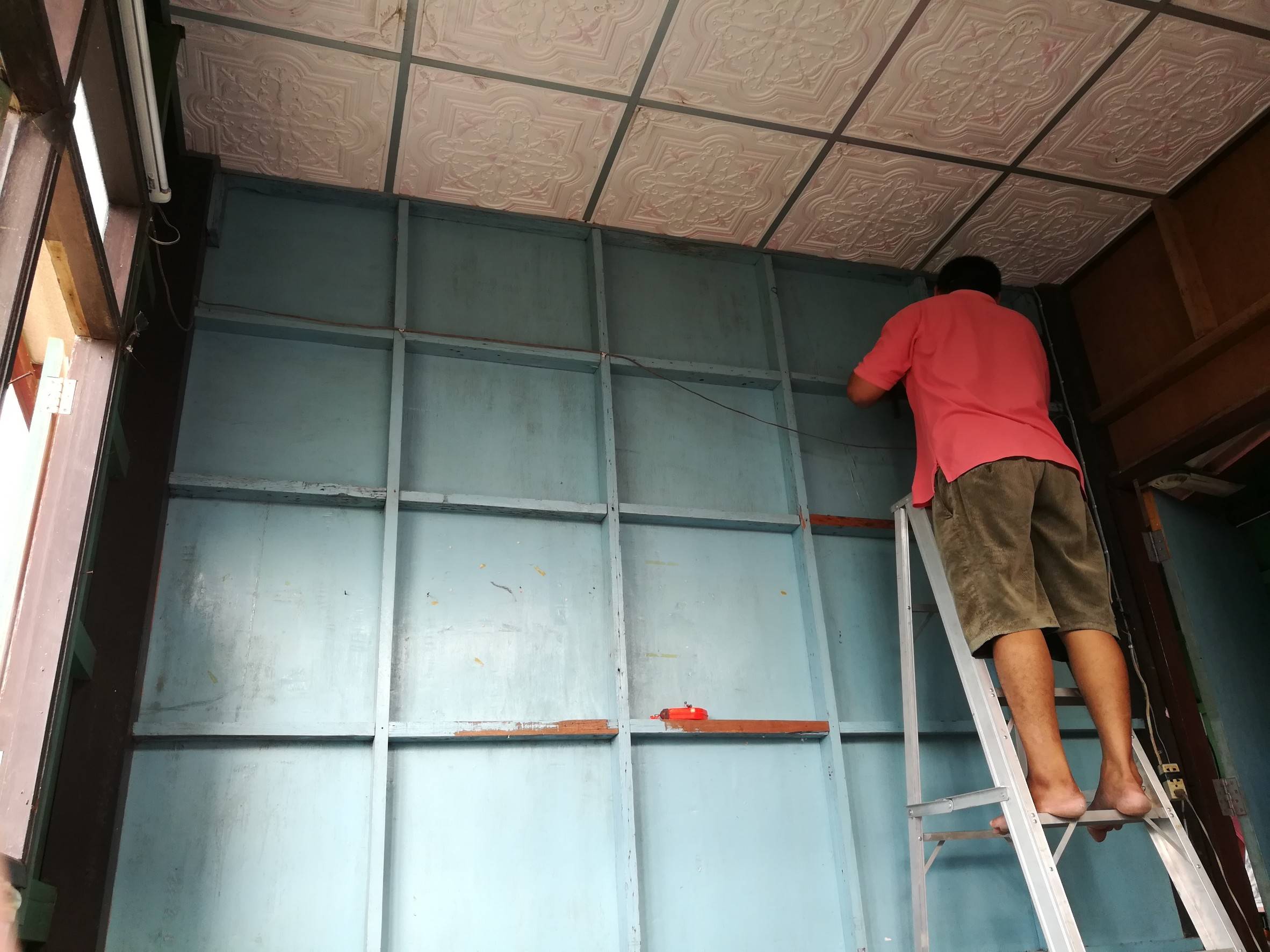 /// วางแผนเสด ก็เรียบรื้อของทั้งหมดออกนอกห้องเลย เริ่มจากการทำผนังก่อน เดิมเป็นผนังไม้ เราเลยให้พ่อซื้อสมาร์ทบอร์ดมาปุให้ผนังห้องเรียบเนียบดสบายตา สมาร์ทบอร์ดที่เราใช้ราคาตกอยู่ที่ 150 บาทต่อแผ่น ใช้ไป 10 แผ่นพอดี