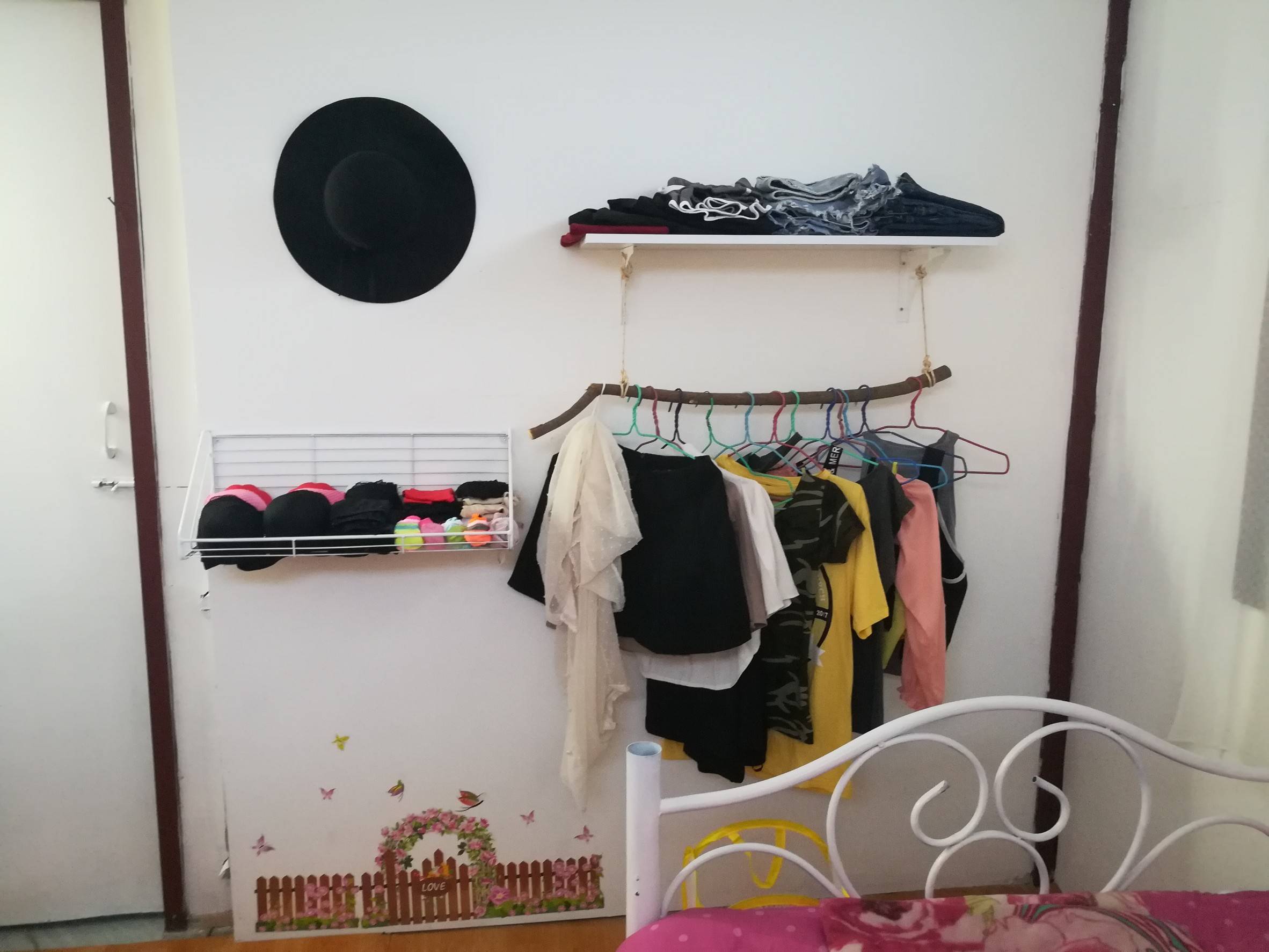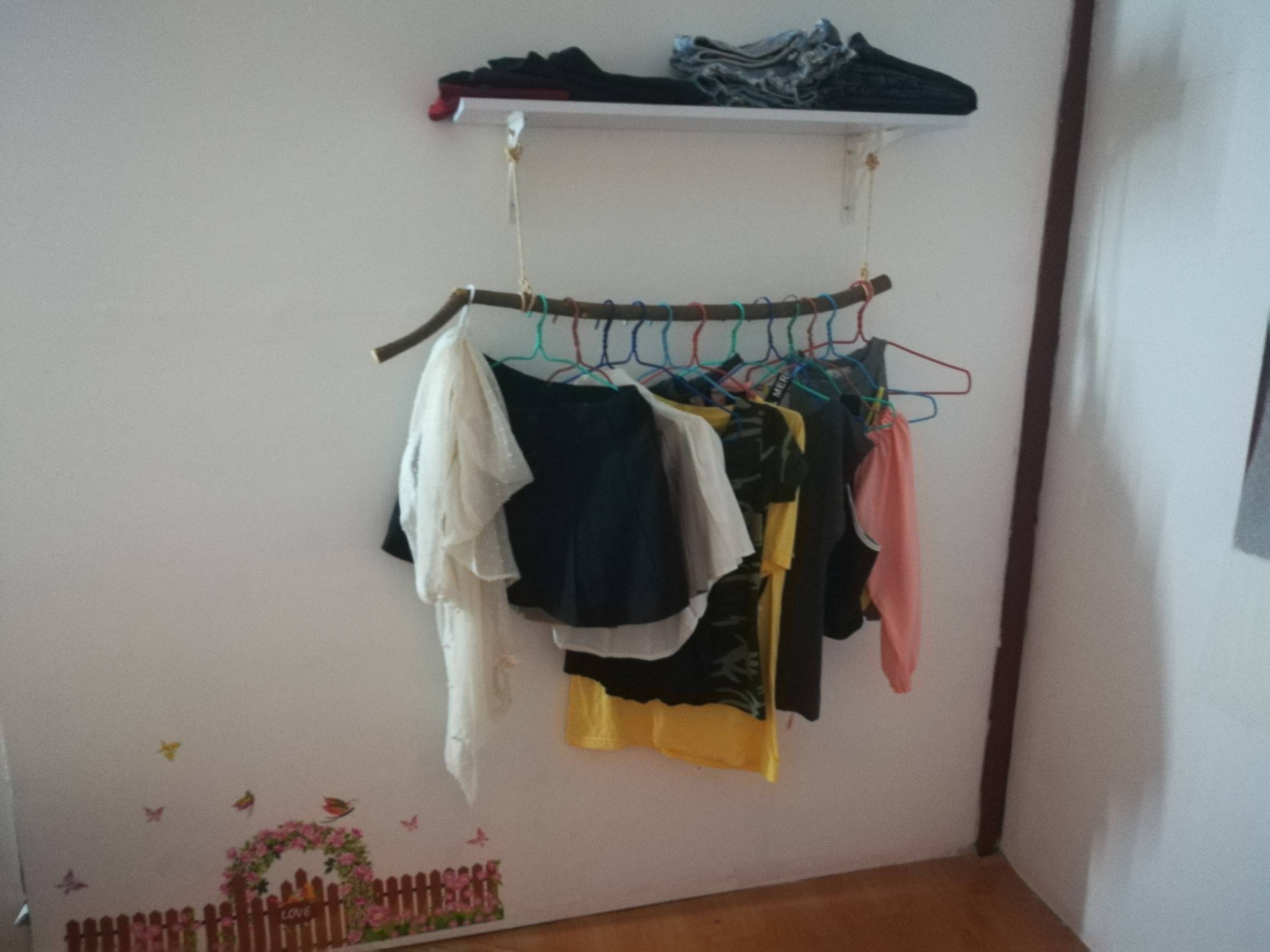 ส่วนพื้นเราทำไรมากไม่ได้ เราซื้อเสื่อน้ำมันสีน้ำตาลมาจากไทยวัสดุ เราประมาน 200 กว่าบาท ปูเต็มห้องพอดีเลย ใช้ตะปูเล็กๆ ตียึดไว้กะที่เลย มาถึงส่วนของตู้เสื้อผ้านะ ตู้มันใหญ่มันแน่นห้องเลย ก่เลยหาดูแบบในเน้ตเจออันหนึ่งเอากิ่งมาแต่งห้อง เห้ยแมร่งเท่วะ เอาด้วยๆ ตัดต้นมะขามเลยจ้า ติดชั้นวางไว้ด้านบนห้อยไม้มะขามไว้แขวนผ้า พูดไปอาจจะงงๆ 555 ดูรูปจะเข้าใจว่ามันเท่ดีนะ 555 ถูกด้วยไงประเด็นอะ