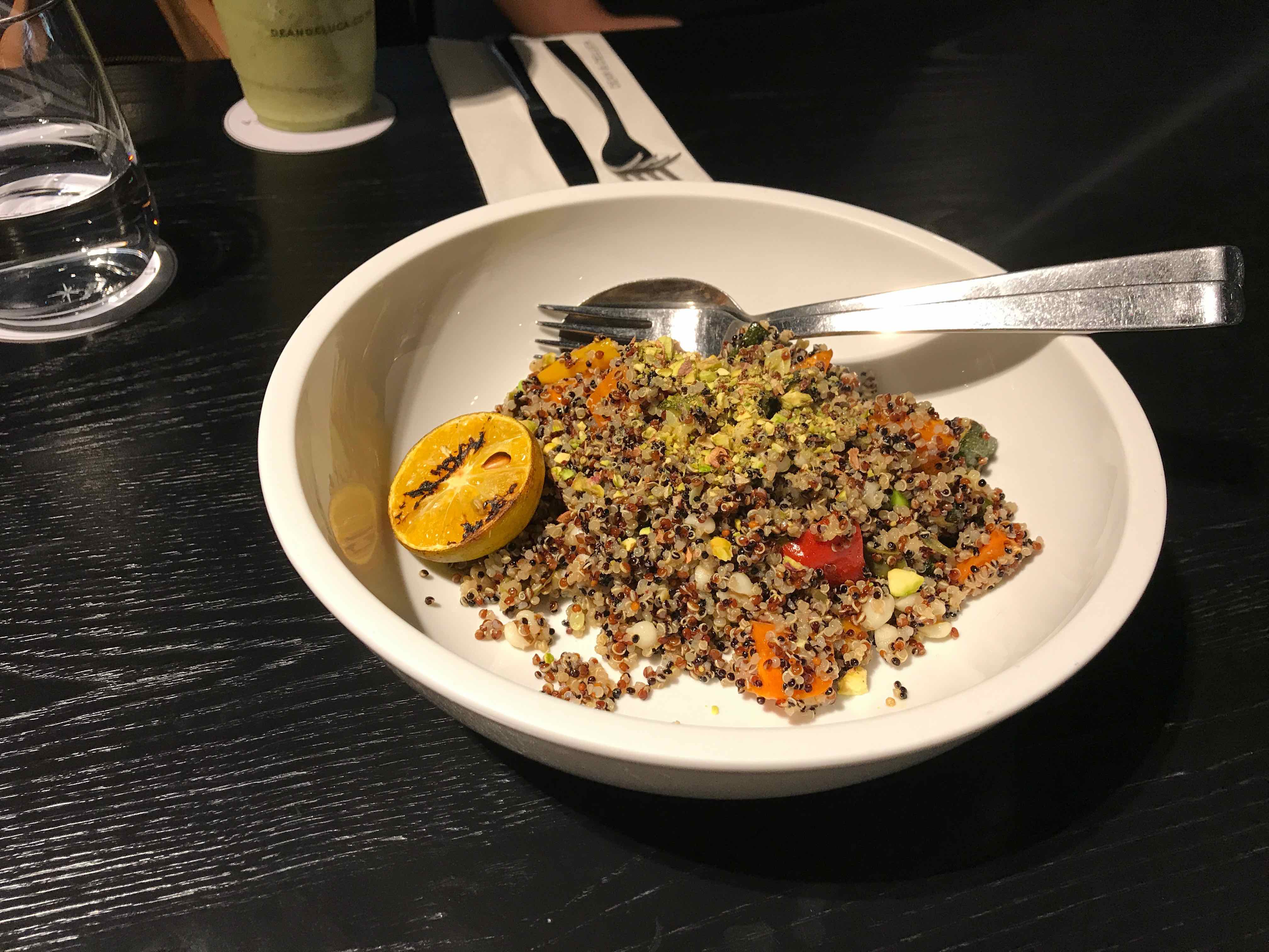 อันนี้เป็นจานแชร์ขอรับ นั้นคือ สลัดคีนัว พูดง่ายๆ คือสลัดธัญพืชนั้นเอง บีบส้มย่างที่เตรียมมาให้ใส่ ออกรสชาติเปรี้ยวๆ มันๆ อร่อยไปอีกแบบ