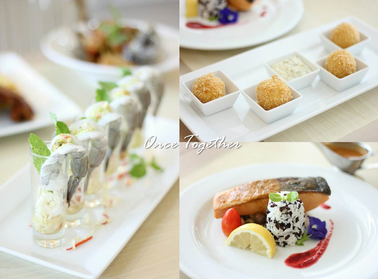 เมนูอาหารที่นี่มีทั้งไทยและเทศให้ได้เลือก เปิดการเสิร์ฟจานแรกด้วย Chicken cheese ball เป็นเนื้อไก่ผสมมอสซาเรลลาชีสเรียกน้ำย่อยได้เป็นอย่างดี แต่ที่เราว่าเด็ดเลยนี่คือกุ้งแช่น้ำปลา เพราะกุ้งที่นี่ตัวใหญ่เต็มปากเต็มคำแถมน้ำจิ้มซีฟู๊ดรสซี้ดซ้าดหอมกลิ่นพริกขี้หนูเหมือนเด็ดมาทั้งสวน เราไม่คิดว่าร้านขนมปังฝรั่งเศสจะมีอาหารไทยรสชาติแซ่บได้ถึงใจขนาดนี้ ส่วนสเต็กแซลมอนเนื้อแน่นๆของแท้จากนอร์เวย์ราดด้วยซอสหัวกุ้งลอบสเตอร์เคี่ยวนานจานนี้ก็อร่อยจนติดลิ้น