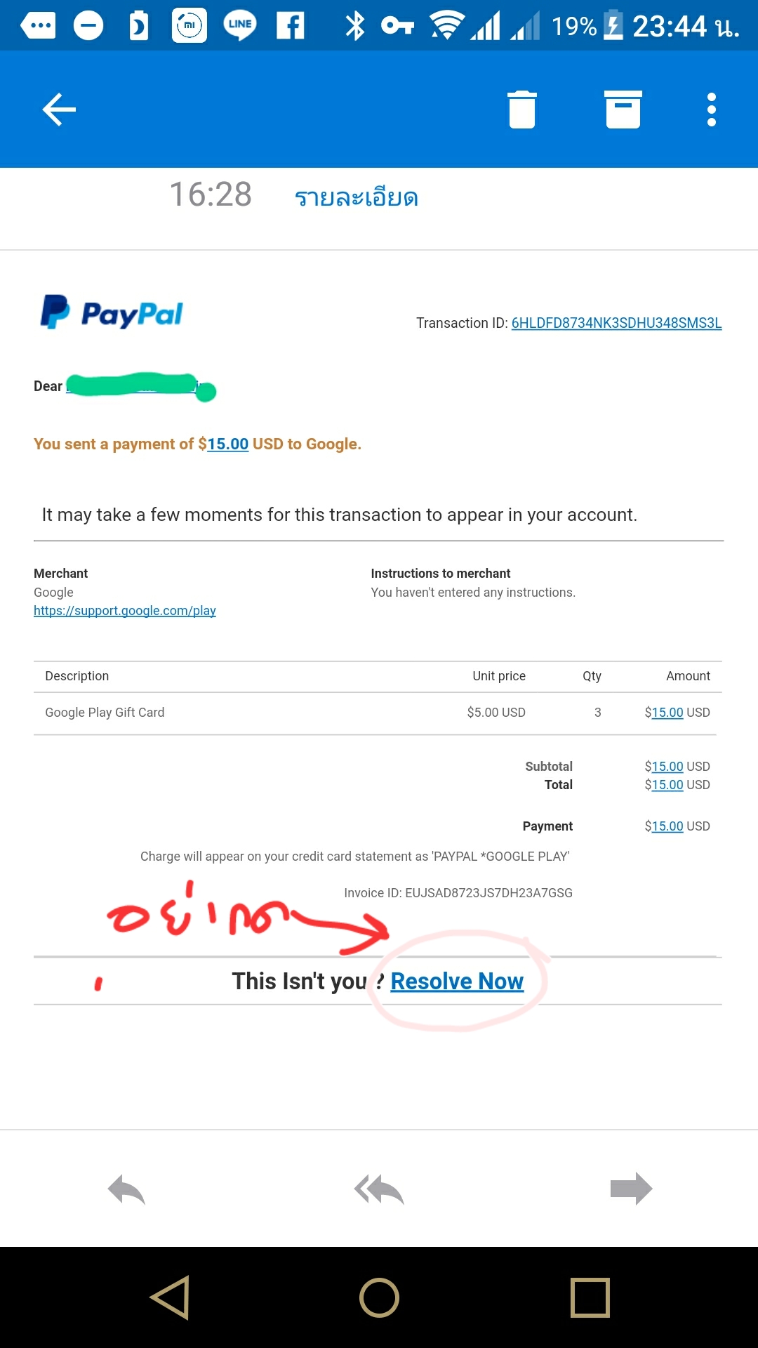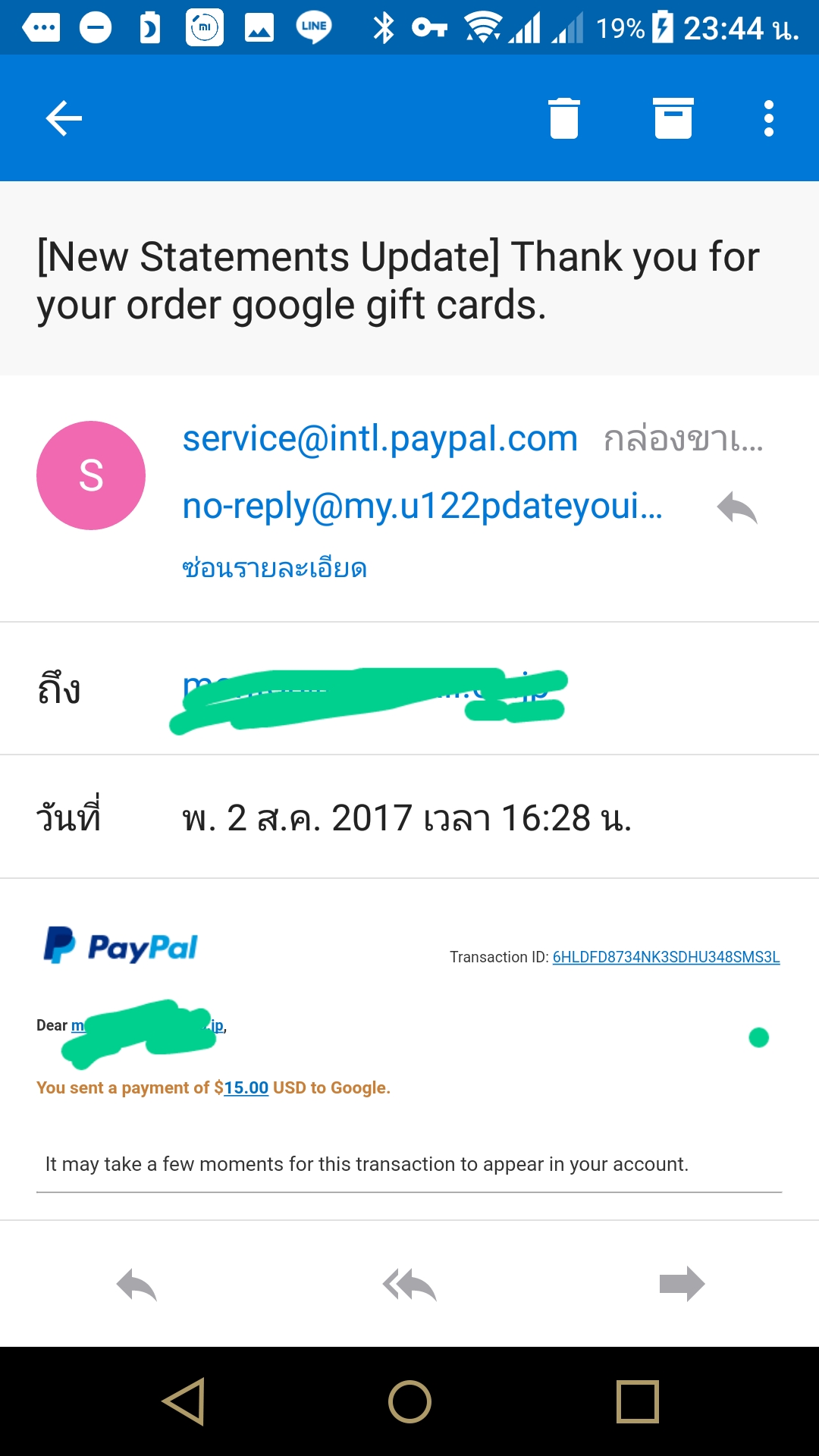 จู่ๆก็มีเมล์มาแจ้งว่า ใช้ paypal ซื้อ google gift cardไป 3 ใบในราคาใบละ 5 usd ครับ