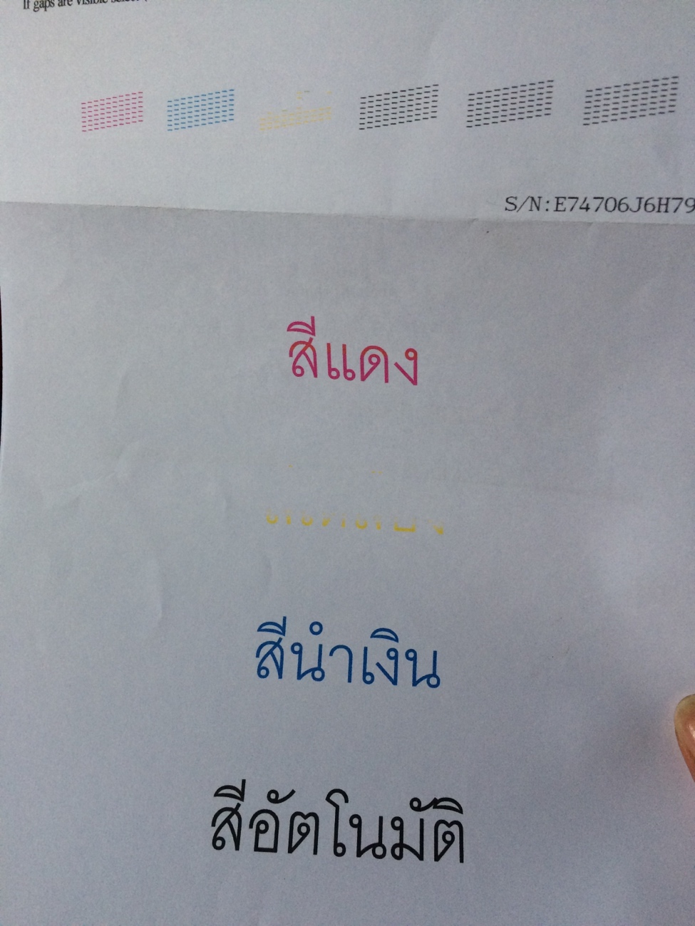 ไม่แน่ใจว่าเกิดจากอะไร เครื่อง brother T300 (สีแดงอาจจะจางหน่อย พอดีว่าผมเบลอ หยิบสีเหลืองใส่ไปซะเต็มเบ้า) ... แต่ปัญหาไม่ได้อยู่ที่ตรงนั้นครับ