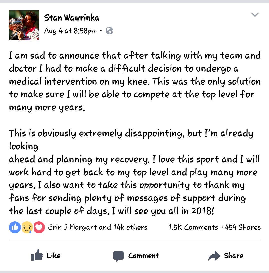 ถือว่ามาตามเทรนด์คนเจ็บจริงๆ สำหรับสแตน วาวรินกา ที่ประกาศปิดครึ่งซีซั่นของตัวเองเพื่อรักษาอาการบาดเจ็บที่หัวเข่าเป็นที่เรียบร้อย