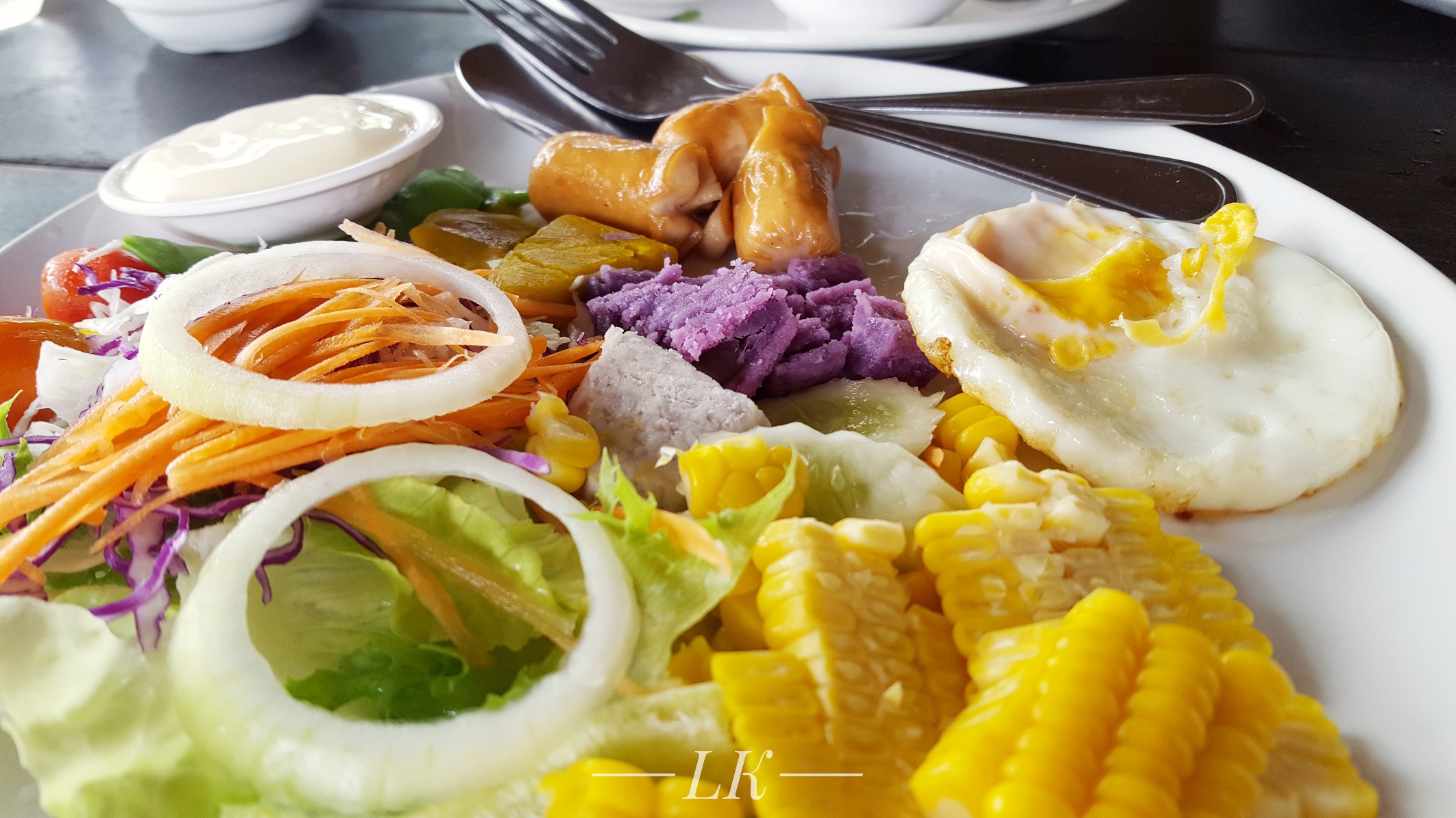 เช้าวันที่ 2 ...... เราตื่นสายหน่อย ออกจากห้องประมาณ 9 โมง เดินลงเนินไปทานอาหารที่ลานรับรองของรีสอร์ท อาหารเป็นแบบบุฟเฟ่ต์ เดินงัวเงียๆเข้าไป พนักงานรีบลุกมายิ้มแย้มต้อนรับ ตอนนั้นมีกลุ่มเราแค่โต๊ะเดียวค่ะ 555 อาหารที่จัดวางไว้ให้บริการตัวเองตอนแรกก็ดูธรรมดาๆไม่ค่อยมีอะไร มีแค่ขนมปังปิ้ง เนย แยม กาแฟ โอวัลติน ข้าวผัด ผัดไท สักพักพนักงานเดินมาบอกว่า "เดี๋ยวมีข้าวต้ม กับสลัดอีกนะคะ จะเอาไปเสิร์ฟให้ที่โต๊ะ"