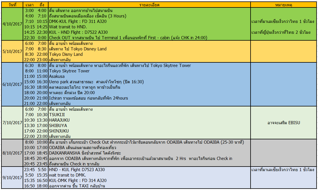 สวัสดดีค่ะ อยากรบกวนเพื่อนๆพี่ๆชวนตรวจแพลนทริปโตเกียว 8 วัน 7คืนให้ด้วยค่า มีรายละเอียดดังนี้ วันที่ 24 ธ.ค 58 เวลา 00.30น. เดินทางจาก กทม-สนามบิน นาริตะ วันที่ 24 ธ.ค 58 เวลา 08.25น. กลับวันที่ 31 ธ.