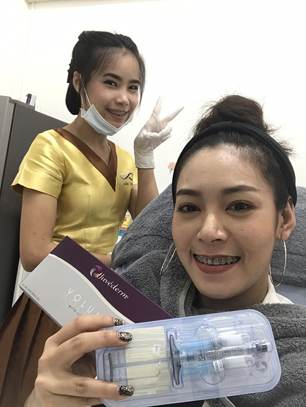 หลังจากปรึกษาคุณหมอแอนเสร็จ หนึ่งในสิ่งที่เราประทับใจมากคือ คุณหมอเขาไม่ยัดเยียดขายคอร์สอะไรเลย แนะนำตามจริง แก้ไขตามส่วนที่เรากังวล อาจมีแนะนำบ้างว่าตรงไหนดีแล้วไม่ควรแก้และตรงไหนที่ควรแก้ไข ซึ่งมันเหมือนเราเข้าไปนั่งคุยกับเพื่อน (ชอบตรงจุดนี้มากจริงๆ) Filler ที่คลินิกใช้เป็นของ Juvederm ค่ะ ปลอดภัย มีอย. สามารถอยู่ได้นานเกือบ 2 ปีเลย โดยก่อนฉีดคุณหมอได้ให้เราสำรวจกล่องและตัวผลิตภัณฑ์ก่อนเพื่อความสบายใจ อุอุ ^-^ จากนั้นก็เริ่มทำความสะอาดหน้า ระหว่างที่กำลังคลีนหน้า คุณหมอก็อธิบายเรื่องของเข็มที่ฉีดว่าจะมีลักษณะเป็นเข็มหัวทู่ (Blunt Cannula) ซึ่งมันอาจจะใหญ่และยาว .. อ้าว ตื่นสิคะ นี่กลายเป็นคนกลัวเข็มไปเลย จะเปลี่ยนใจตอนนี้ก็ไม่ทันแล้วด้วย T^T เลยได้แต่เอาวะ ทนเจ็บแปปเดียว เดี๋ยวก็เสร็จ ..