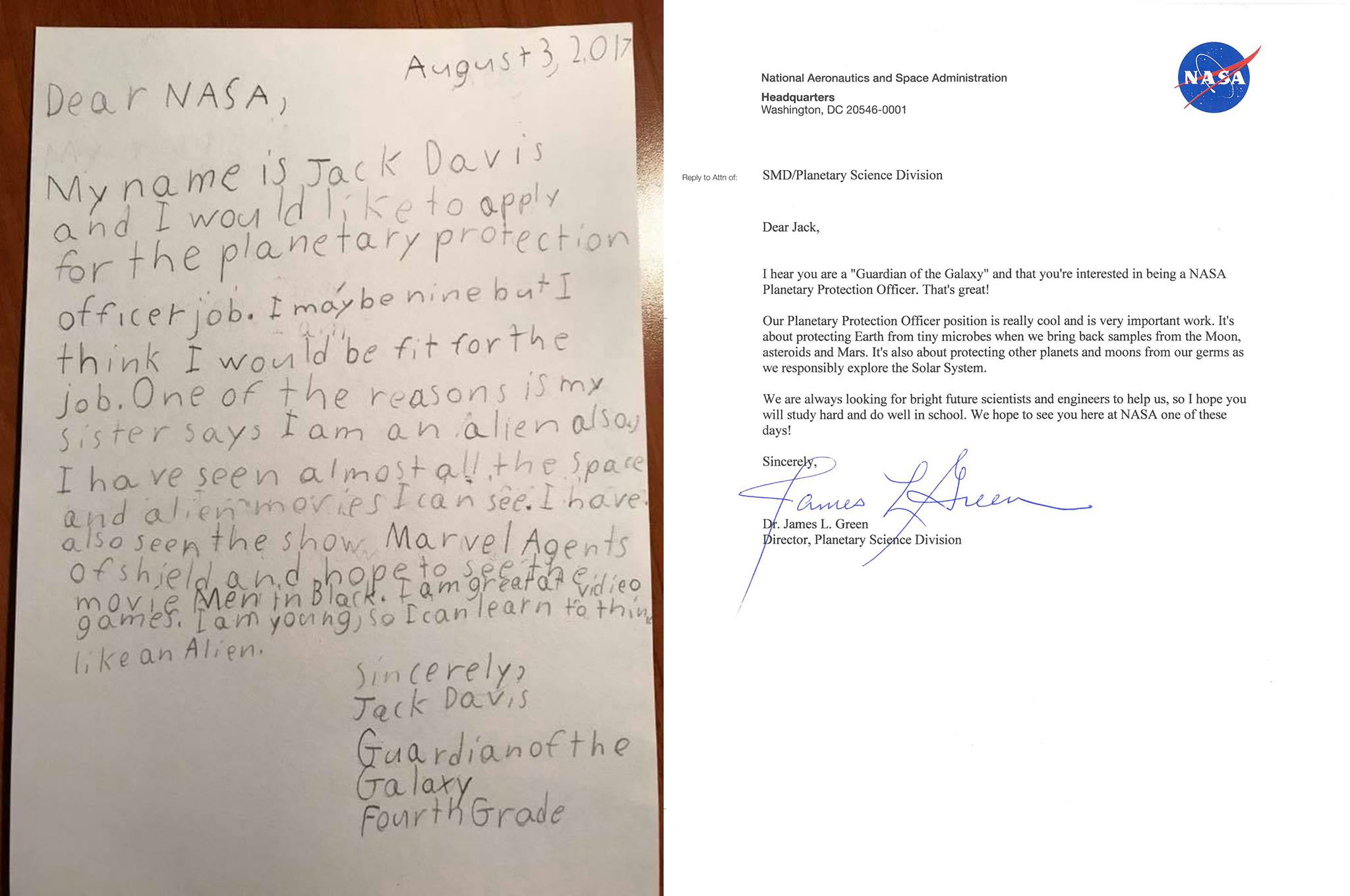 .....บอกว่า "สวัสดีครับ ผมชื่อ Jack ผมอยากสมัครเป็น Planetary Protection Officer ตอนนี้ผมอายุ 9 ขวบ และผมคิดว่าผมเหมาะกับงานนี้นะ เหตุผลเพราะว่าน้องสาวผม (หรือพี่สาวก็ไม่รู้นะ) บอกว่าผมเป็นเอเลี่ยน แล้วผมก็ดูหนังเกี่ยวกับอวกาศ และหนังเอเลี่ยนมาเยอะ ดูเกือบจะทุกเรื่องเท่าที่ผมจะหาดูได้ ผมเคยดูโชว์ของหน่วย shield และผมก็อยากเจอ Men in Black ด้วย แล้วอีกอย่างผมเล่นเกมเก่งด้วย ดังนั้นถึงผมจะเด็กแต่ผมก็เรียนรู้อะไรที่เกี่ยวกับเอเลี่ยนได้นะ" .....