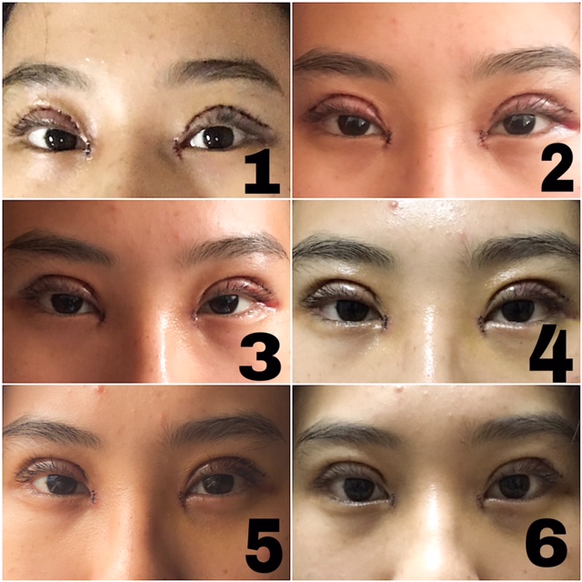 ภาพนี้เป็นภาพเปรียบเทียบตาตั้งแต่วันแรกจนถึงวันที่ 6 ค่ะ (อาจจะบวม และมีรอยช้ำบาง เนื่องจากเป็นการกรีดตาแบบยาว)