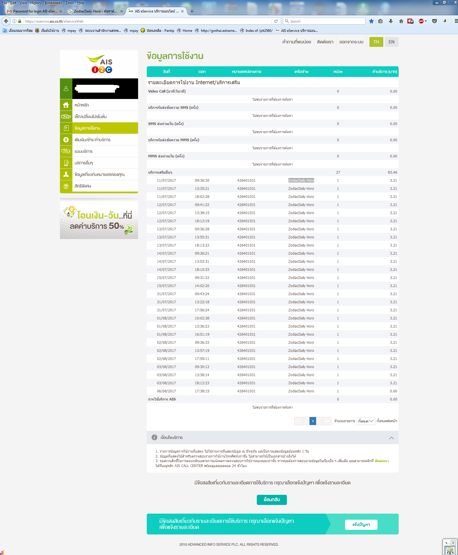 แต่ระบบ online service เช็กข้อมูลย้อนหลังได้แค่ 30 วัน  พบว่าหักเงินไป 27 ครั้ง 83.46 บาท