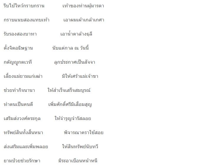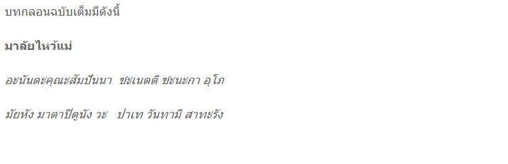 โอ้ เทพธิดา วรรณะงาม ล้ำเลิศ งาม เฉิดฉาย เจิดจ้า น่าพิศวง กรีดกรายร่ายรำ ในวิมาน อันมั่นคง เสียงทิพย์ นั้นคง ดังกึกก้อง ไพเราะ จริง กลิ่นหอม รื่น ระรวย ฟุ้งกระจาย จากกายา มงกุฎมาลา วาบวับ ชวนให้ยิ่ง ใ
