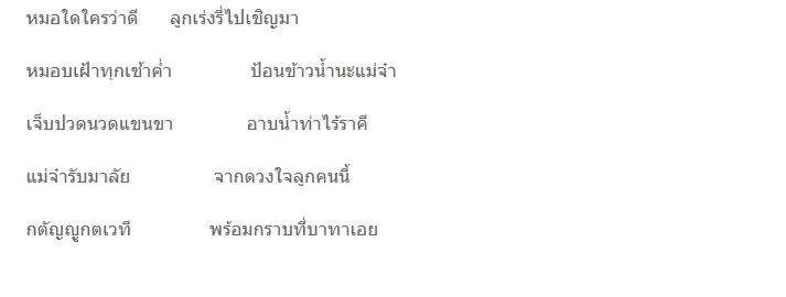 มะลิหอมน้อมวางข้างข้างตัก กรุ่นกลิ่น "รัก" บริสุทธิ์ผุดผ่องใส แทนทุกคำทุกถ้อยร้อยจากใจ เป็นมาลัย "กราบแม่" พร้อมน้อมบูชา