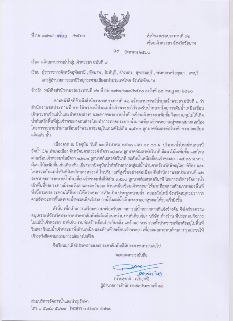 สำนักงานชลประทานที่ 12 ออกหนังสือเตือนด่วนถึง 7 จังหวัด โดยเฉพาะอยุธยา ว่าต้องเร่งปล่อยน้ำเพิ่มลงเจ้าพระยา เพราะมวลน้ำเหนือไหลหลากเดินทางมาถึงปากน้ำโพแล้ว