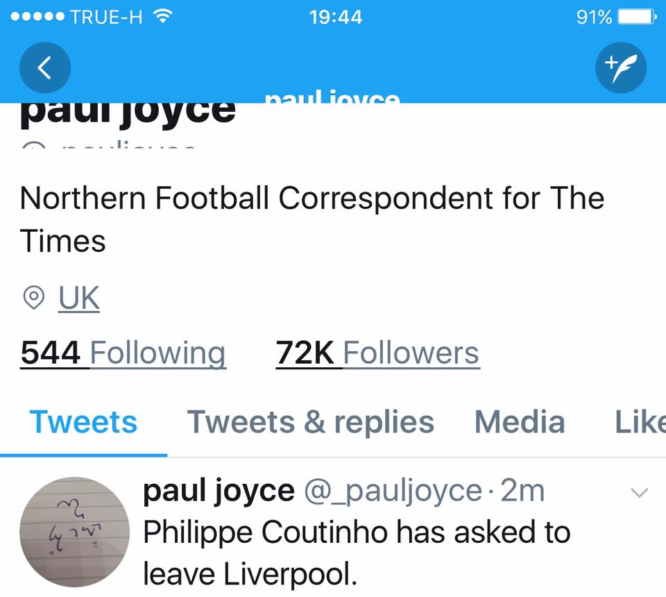 ** อยากย้ายก็ย้ายไปเถอะ BREAKING: Paul Joyce รายงานว่า Coutinho ได้ร้องขอที่จะย้ายออกจากลิเวอร์พูล **
