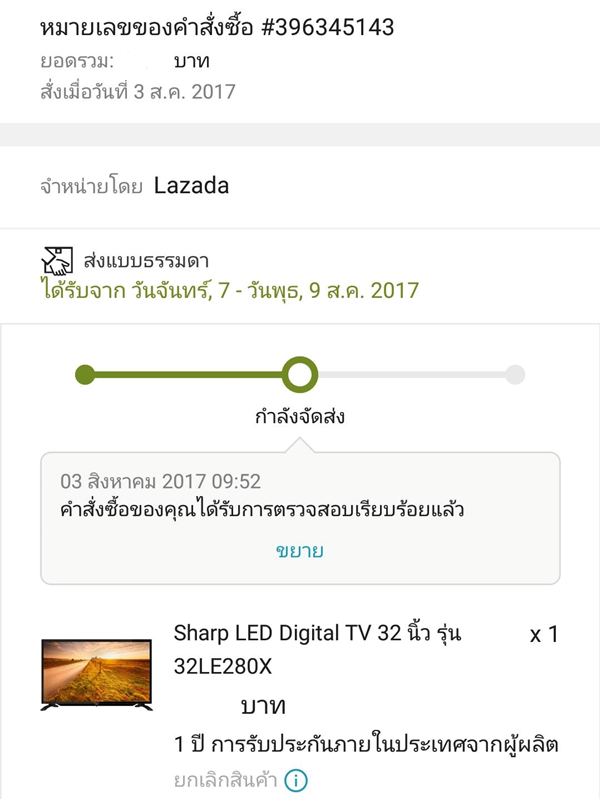 ผมเป็นเด็กบ้านนอกครับ มาทำงานที่กรุงเทพ  วันแม่ปีนี้ไม่ได้กลับบ้านที่ต่างจังหวัด จึงตั้งใจซื้อ TV จอใหญ่ผ่าน Lazada  (จำหน่ายและส่งโดย Lazada )ส่งให้แม่เป็นของขวัญวันแม่ สั่งซื้อวันที่ 3 สค 60  จ่ายเงินแล้ว ส่งได้วันที่ 6 -9 สค  พอซื้อเสร็จ โทรบอกพ่อกับแม่ ทุกคนตื่นเต้นมากเพราะ ทีวีสีบ้านเราเก่าและใช้มานานเป็นสิบปีแล้ว อยากมีทีวีจอใหญ่ไว้ดูละคร  แม่รอทีวีมาส่งทุกวัน ผมเองก็โทรคุยกับท่าน ก็บอกว่า อยากได้ทีวีเร็วๆ ก่อนหน้านี้โทรไปถาม Lazada  2 รอบ เขาก็บอกให้รอ และอยู่ในขั้นตอนจัดส่ง เรารอจนวันที่ 11 (วันนี้) ของมาส่งที่บ้าน แม่ดีใจมาก ผมก็ดีใจที่มีได้ของขวัญ  แม่รอให้พี่ชายกลับบ้านเพื่อติดตั้ง TV ใหม่ให้ แต่พอเปิดกล่องสินค้า พบว่า ไม่มี ขาตั้ง และ Remote control จึงใช้ดูไม่ได้ แม่โทรมาเล่า รู้สึกว่าท่านเสียใจ และรอมาหลายวัน ผมถามกลับไปทาง Lazada  เขาบอกเปลี่ยนของไม่ได้ ต้องคืนของ และ รับเงินคืนเท่านั้น