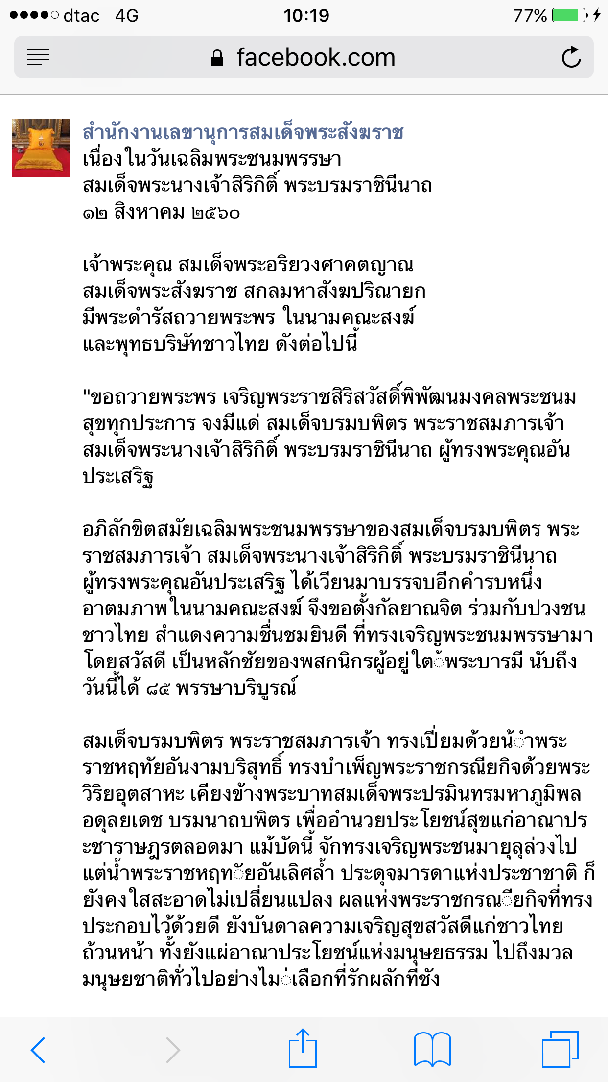 สมเด็จพระสังฆราชมีพระดำรัสถวายพระพรเนื่องในวันเฉลิมพระชนมพรรษาฯ 12 สิงหาคม
