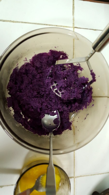 1. เริ่มจากเอามันม่วงไปนึ่งจนสุก แล้วบดละเอียด และนำไปชั่งให้ได้ 300 g.