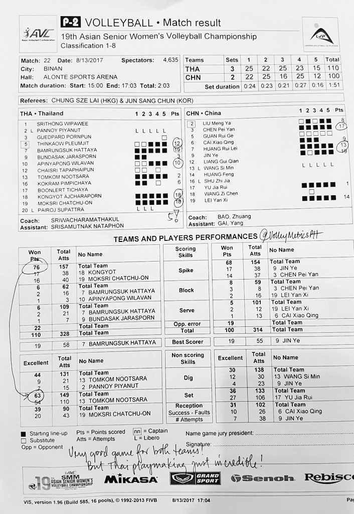 สถิติ วอลเลย์บอล U23 นัด1 ไทย-จีน