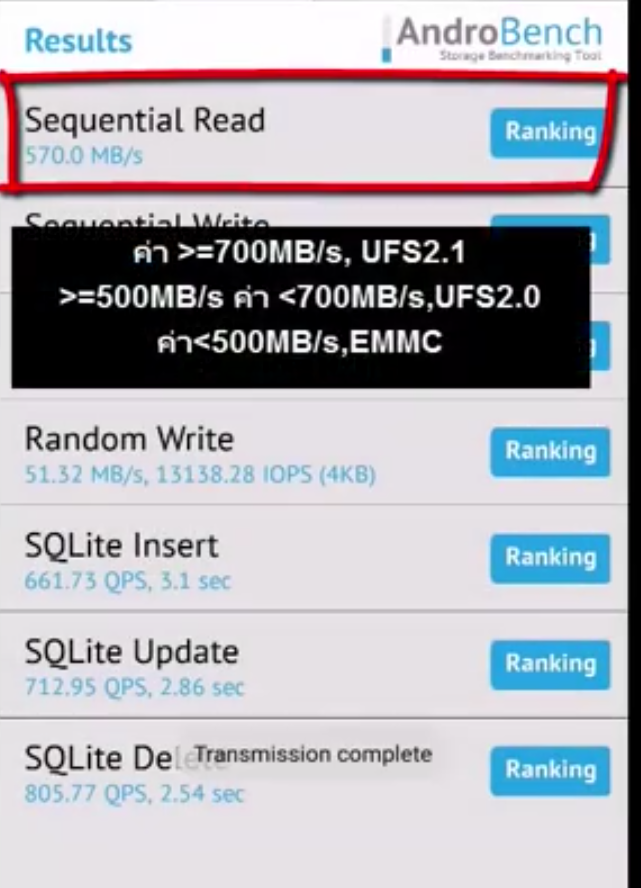 ตอนนี้ในเพจมีการใช้โปรแกรม Androbench ในการเทสการเขียนอ่านข้อมูล แล้วปรากฏว่าแต่ละเครื่องได้คะแนนไม่เท่ากัน เหมือน Huawei แอบใส่หน่วยความจำภายในที่ไม่ใช่ UFS 2.1 ในทุกเครื่อง แต่แอบเอาตัว UFS 2.0 คละใ