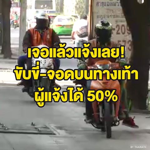 พบผู้กระทำผิด ขี่หรือจอดมอไซต์ รถยนต์ บนทางเท้า แจ้งไป กทม. รับรางวัลกึ่งหนึ่ง !!