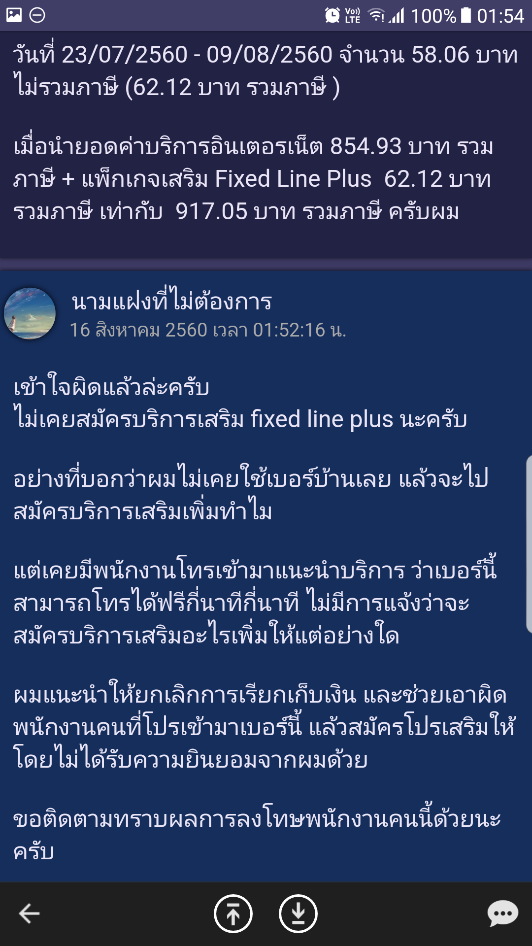 มีพนักงานโทรมาประชาสัมพันธ์ พูดจายืดยาวหลายนาที เหมือนแนะนำการใช้งานโทรฟรี แล้วแอบสมัครโปรเสริมเบอร์บ้าน fixed line plus ให้โดยไม่มีการแจ้งรายละเอียดว่าจะมีการเรียกเก็บค่าบริการเพิ่ม