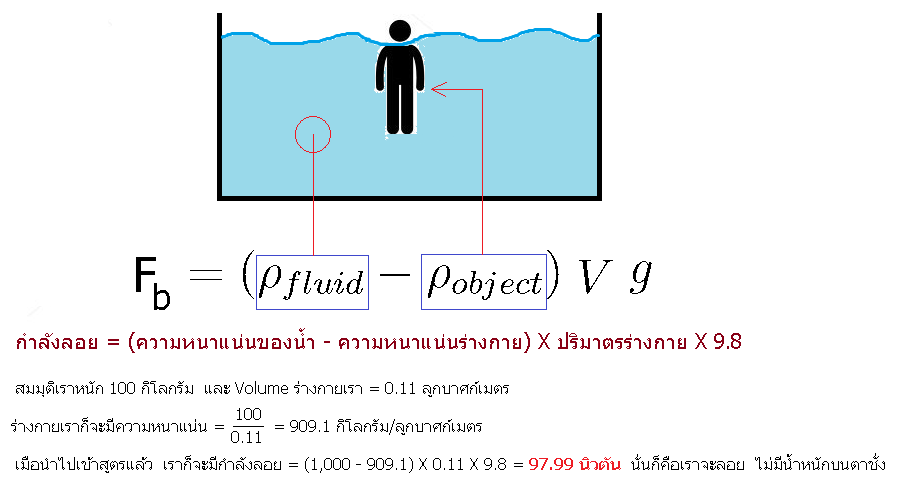 เพราะปริมาตรของร่างกายเราจะต้องนำไปแทนที่น้ำก่อนครับ แล้วก็คำนวณตามภาพนี้ได้เลย