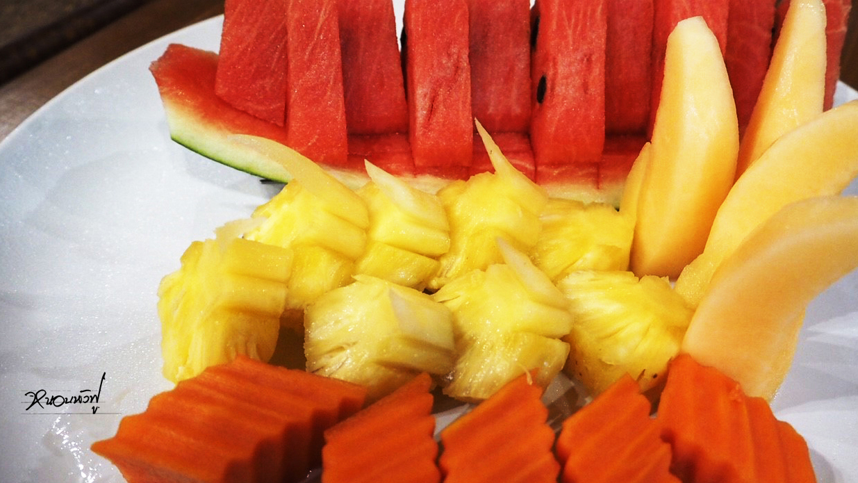 พอกลับมาถึงรีสอร์ท ก็นัดกันว่า จะว่ายน้ำ ดำน้ำเล่นกันในสระว่ายน้ำนี่ล่ะ ไหนๆ ก็ออกไปดำน้ำไม่ได้ ดำมันในสระนี่ล่ะ พอกลับมา ก็เจอกับอาหารว่างน่ารักๆ แบบนี้