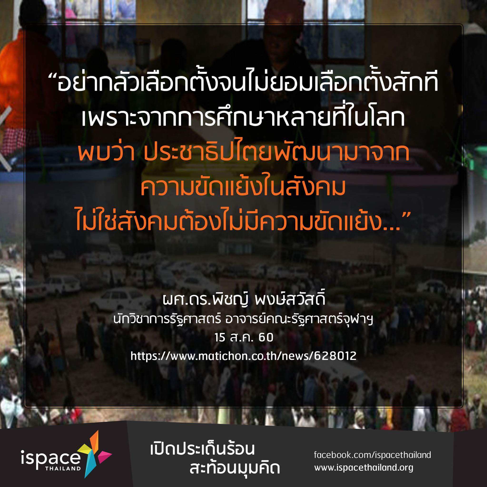 อย่ากลัวเลือกตั้งจนไม่ยอมเลือกตั้งสักที เพราะจากการศึกษาหลายที่ในโลก พบว่า ประชาธิปไตยพัฒนามาจากความขัดแย้งในสังคม ไม่ใช่สังคมต้องไม่มีความขัดแย้ง...