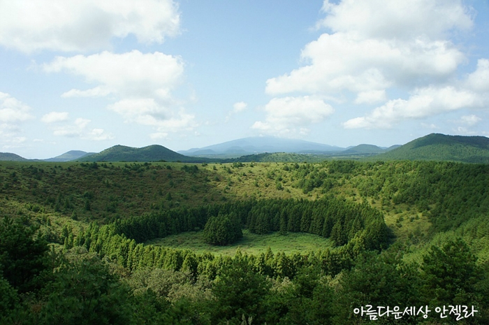 กึมโอรึม 'Gold ascension' เป็นหนึ่งในไม่กี่แห่งที่เกาะเชจูซึ่งมีหมอก สถานที่ด้านบนซึ่งสามารถมองเห็นต้นไม้ ทะเลสาบที่เขียวชอุ่ม