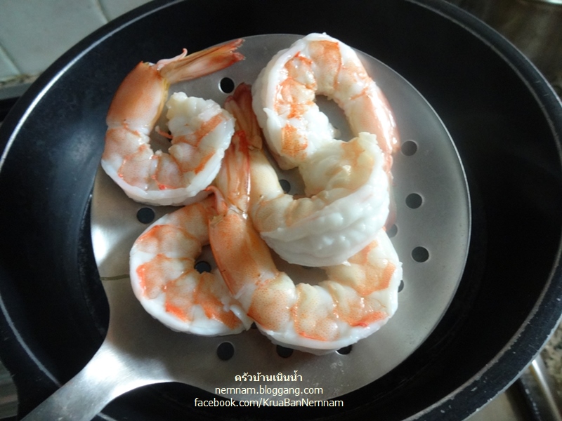 กุ้งเด็ดหัวไว้หาง แกะเปลือกผ่าหลังเอาเส้นดำออก ลงลวกให้สุกตักขึ้นพักไว้