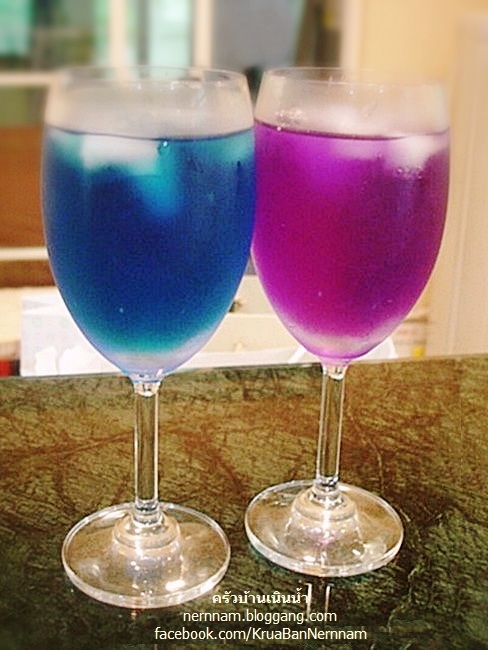 (ปล.น้ำอัญชัญสีน้ำเงิน ถ้าต้องการสีม่วง ให้หยดน้ำมะนาวลงไปเล็กน้อยค่ะ)