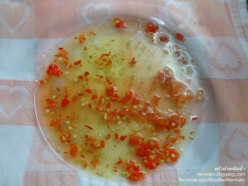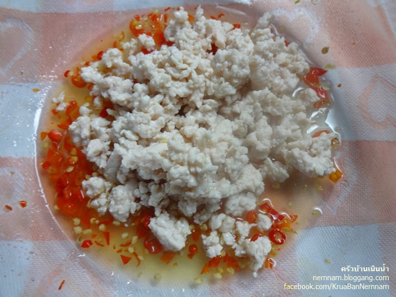 ผสมน้ำยำโดยใส่พริกขี้หนูสับ น้ำปลา น้ำตาล และน้ำมะนาว คนผสมให้เข้ากันดี