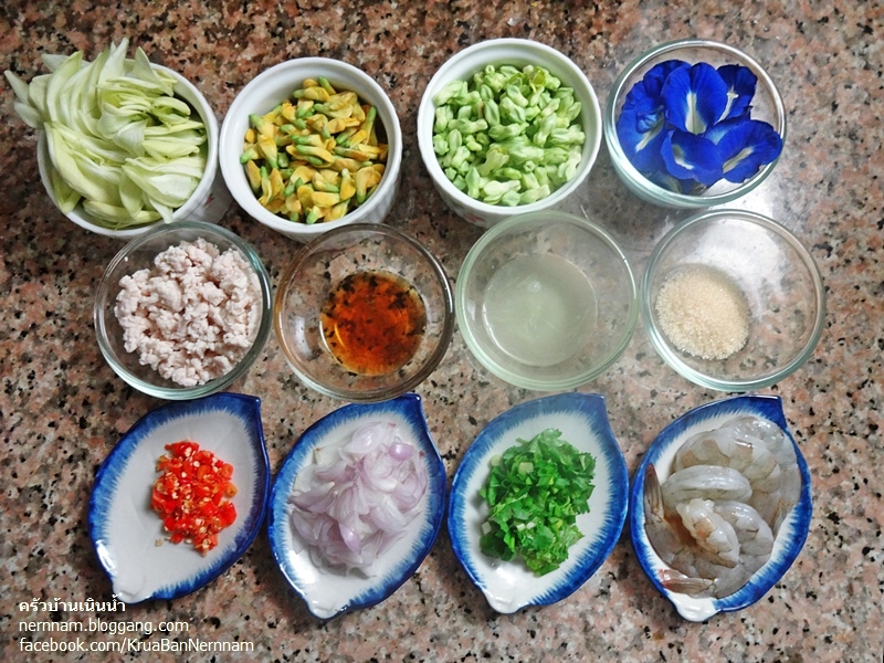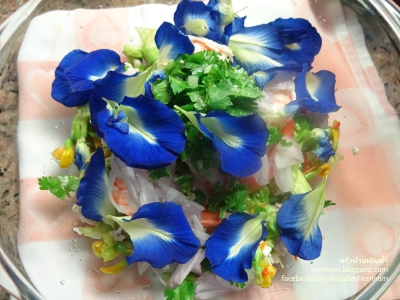 ใส่หอมแดง ผักชีต้นหอม และใส่ดอกอัญชัญสุดท้าย ผสมเบา ๆ พอเข้ากัน