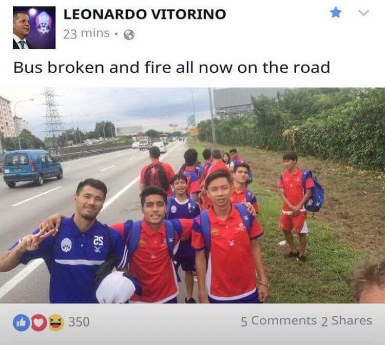 รถบัสรับส่งนักฟุตบอลกัมพูชาเสียกลางทาง