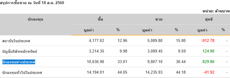 Sinthorn Summary 18/8/2560 : ต่างชาติซื้อสุทธิ 829.80 ลบ.