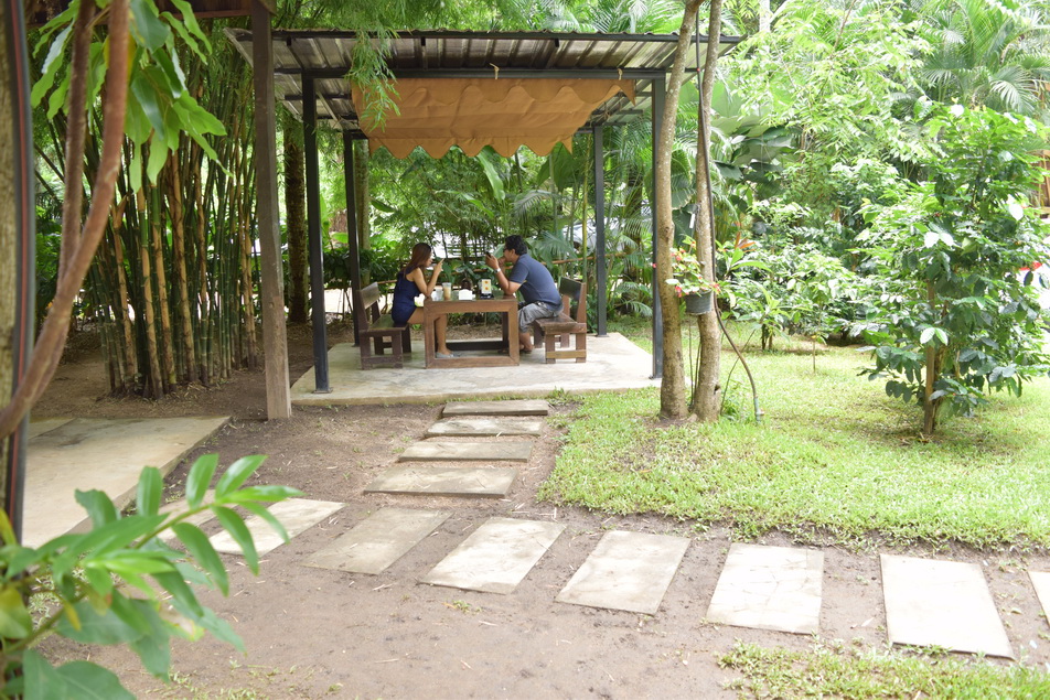 เฟิร์นมาถึงที่ร้านก็คิดว่าจริงตามที่เพื่อนบอกค่ะ คือดีที่มาก่อนเที่ยง ไม่งั้นไม่มีที่จอดรถแน่ๆ แล้วร้านก็ดูไม่ร้อนมากนัก (ตอนแรกคิดว่าจะร้อนหน่อยเพราะดูภาพจากรีวิวก่อนมา) ตรงกันข้ามกลับรู้สึกได้ถึงความเขียวชอุ่มของต้นไม้ที่โอบล้อมร้านเอาไว้ในหุบเขา พอเราเดินเข้าไปก็รู้เลยว่าร้านนี้ขายกาแฟแน่ๆ เพราะมีต้นกาแฟปลูกไว้โดยรอบ ตั้มที่ไม่เคยเห็นต้นกาแฟยังงงๆ ว่าเมล็ดแดงๆ นี่หรอต้นกาแฟ ซึ่งร้านบ้านสวนกาแฟเค้าปลูกไว้ทั้งทางเดิน และโซนกินข้าว ให้บรรยากาศเข้ากับธารน้ำเล็กๆ ที่ไหลผ่านใจกลางร้านทำให้รู้สึกเย็นๆ สบายตาดี