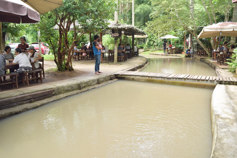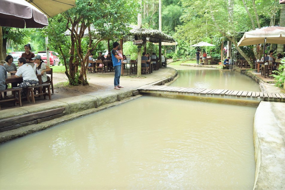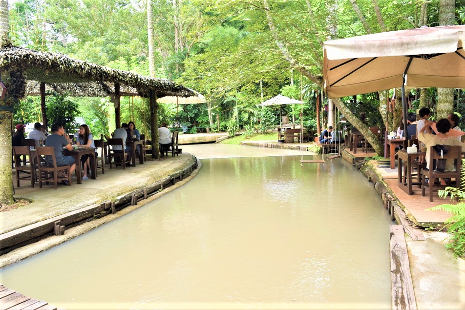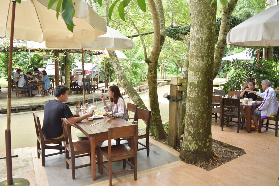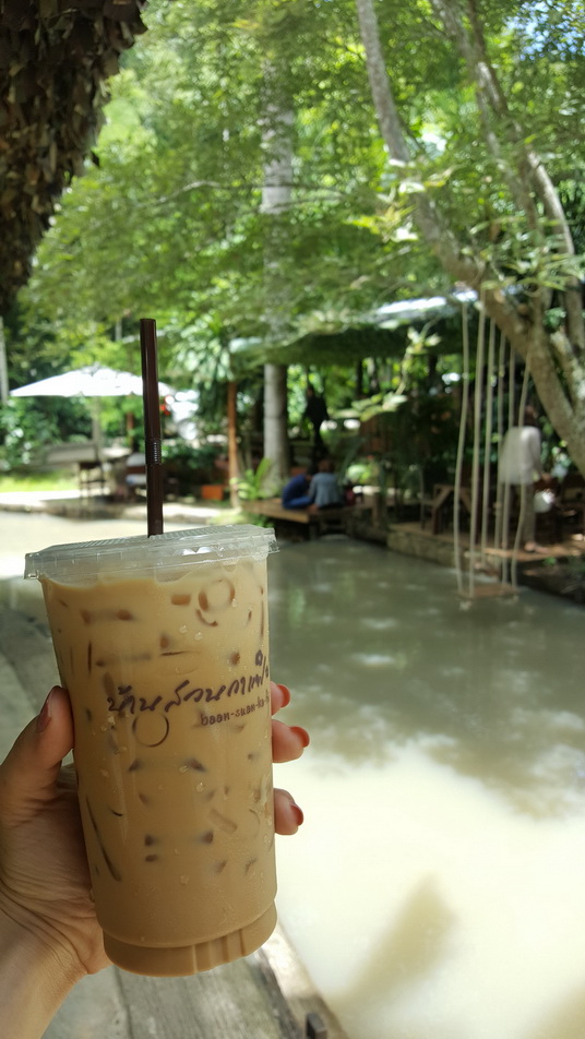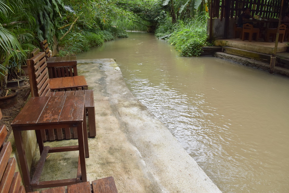 ตอนไปถึงที่นั่งดีๆ ริมธารถูกจับจองไปหมดแล้ว เราเลยได้โต๊ะเขยิบจากริมน้ำมานิดหน่อย (คิดว่าน่าจะต้องมาก่อน 11 โมงค่ะ ถึงจะได้ที่นั่งริมน้ำ) ที่นั่งที่ดีที่สุด ..แต่น่าจะเหมาะกับครอบครัวที่มีเด็กๆ คือโต๊ะที่ติดกับชิงช้าที่ยื่นไปในน้ำ ดูเด็กๆ ที่มามีความสุข ยิ้มแก้มปริกันเลยทีเดียว