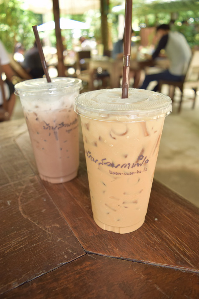 มาดูกาแฟของที่ร้านบ้านสวนกาแฟกันบ้าง (ราคาแบบเย็น 65-80 บาท) กาแฟเข้มข้นดีเลยทีเดียว เฟิร์นสั่งคาปูชิโน่ (ราคา 75 บาท) ให้มาแก้วใหญ่ รสชาติเข้มกำลังดี แถมราคาก็ไม่แพงมากด้วยค่ะ