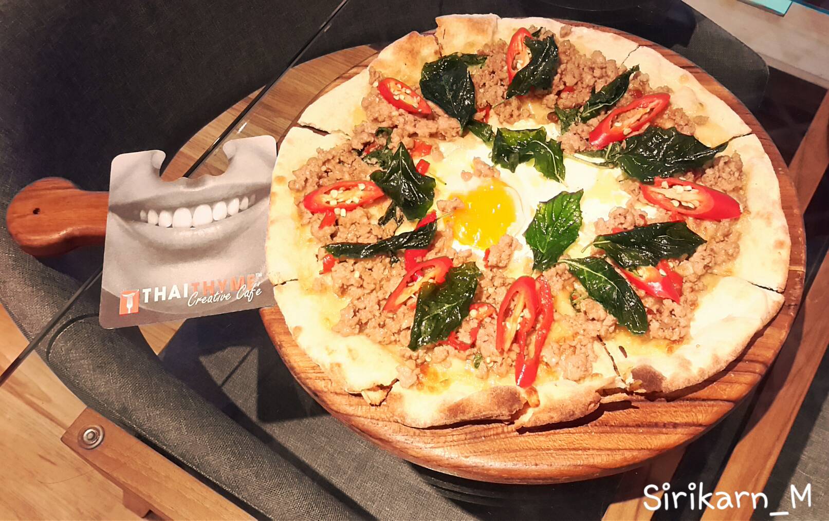เป็นเมนูฟิวชั่นของทางร้าน ที่เอาผัดกะเพราหมูสับมาทานคู่กับพิซซ่า
