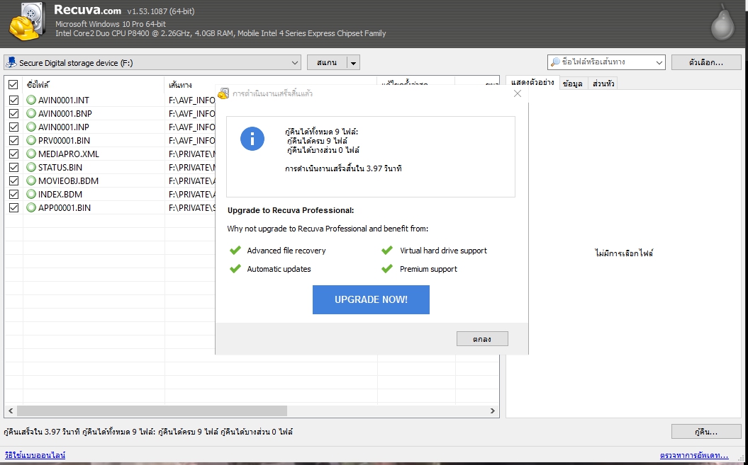 card recovery แต่ผลที่ได้คือ ไม่เจอรูปเลย เจอแต่ไฟล์ของระบบกล้อง 9 ไฟล์ (สแกนแบบ deep หลายรอบด้วยครับ)