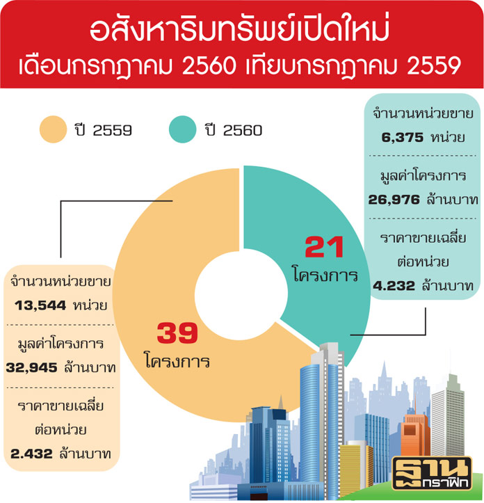 ทั้งนี้ หากพิจารณาภาพรวมใน 7 เดือนแรกปี 2560 (มกราคม-กรกฎาคม 2560) เปรียบเทียบกับ 7 เดือนแรกปี 2559 พบว่า มีจำนวนโครงการที่เปิดใหม่รวม 219 โครงการ (ลดลง -14%) มีจำนวนหน่วยขายรวม 60,764 หน่วย (ลดลงประมาณ -2%) มูลค่าโครงการรวม 211,469 ล้านบาท (เพิ่ม 11%) และมีราคาขายเฉลี่ยต่อหน่วยเพิ่มจาก 3.101 ล้านบาท เป็น 2.480 ล้านบาท (18%)