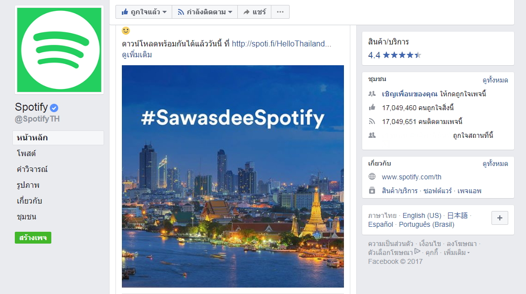 สงสัยเฟซบุ๊กแฟนเพจของ spotify ที่พึ่งเปิดตัวในไทยได้ไม่นานแต่มีคนไลค์ถึง 17 ล้านคน